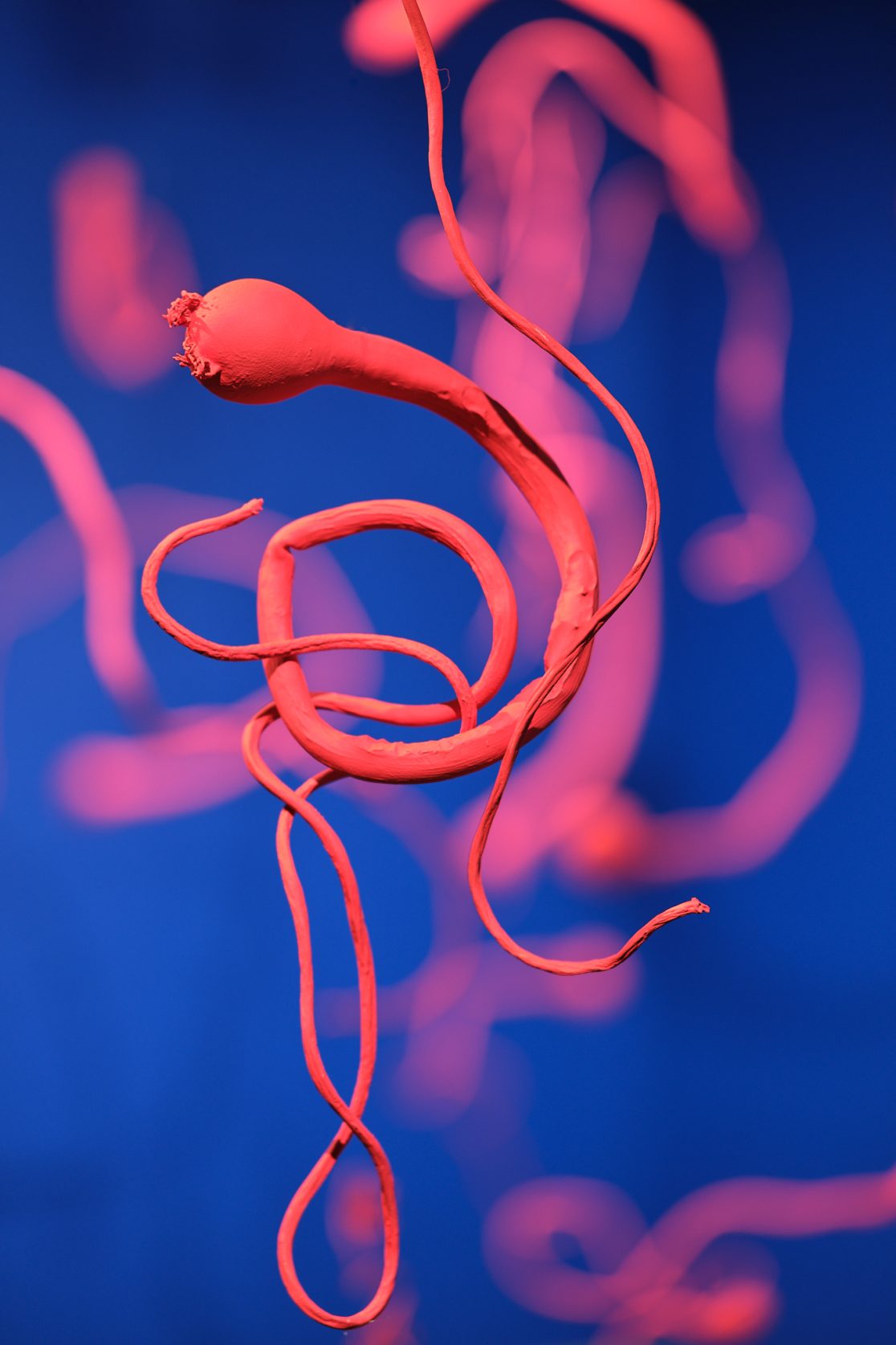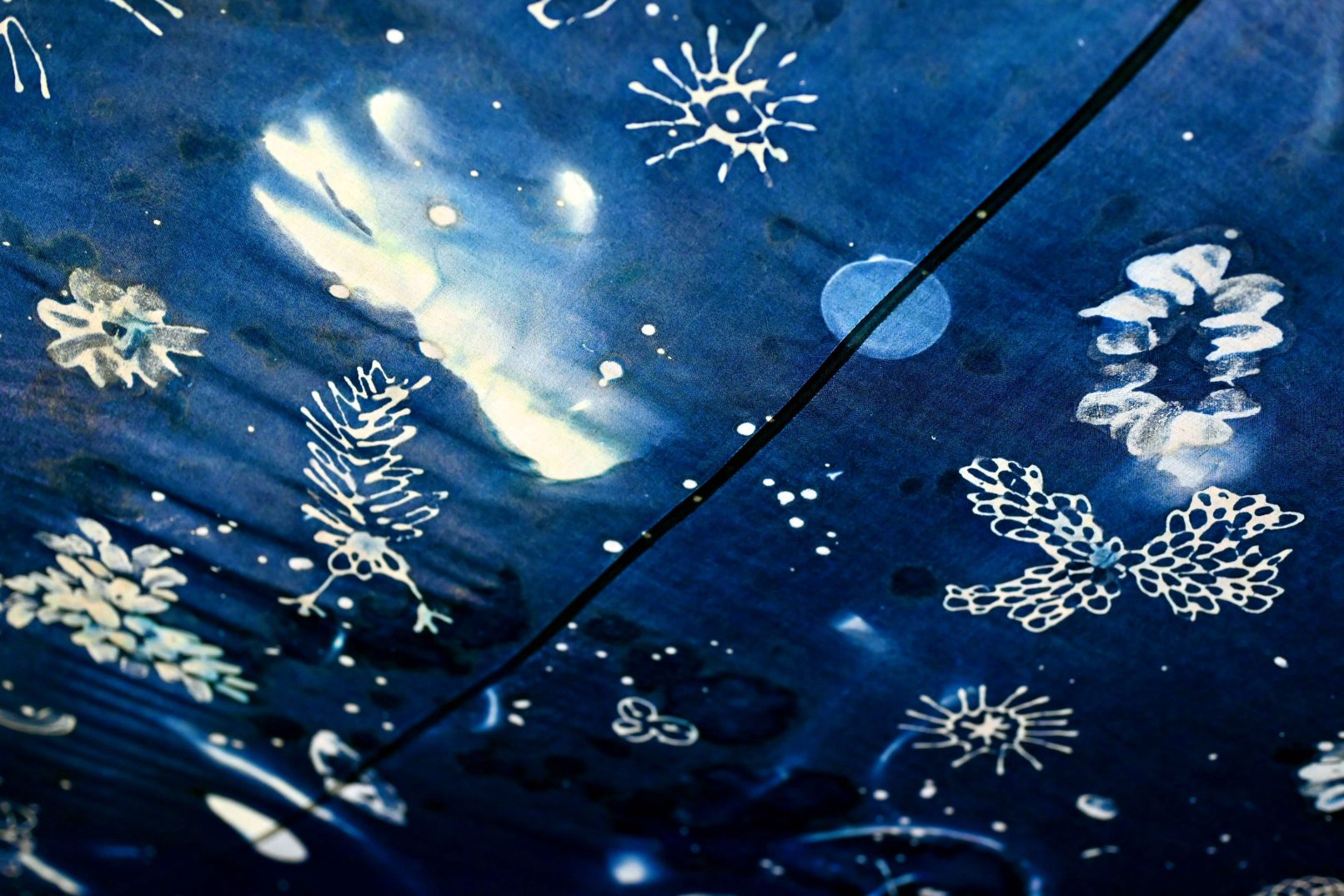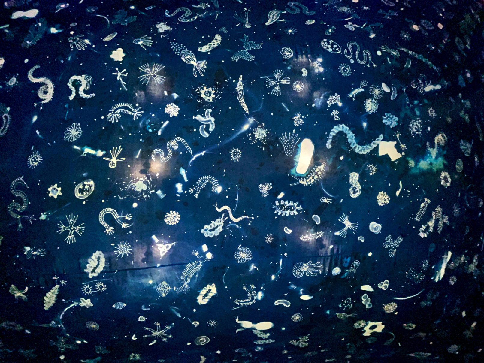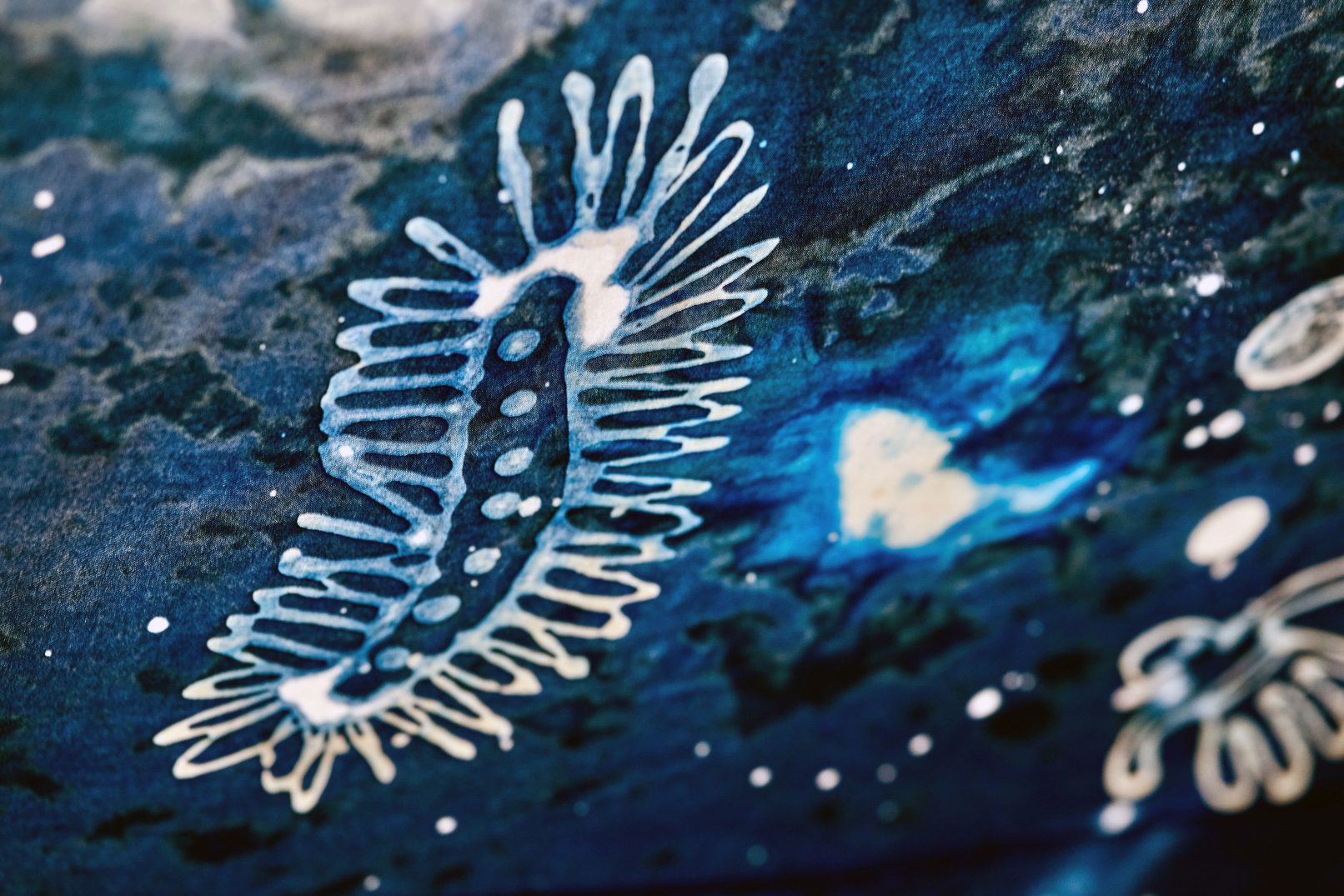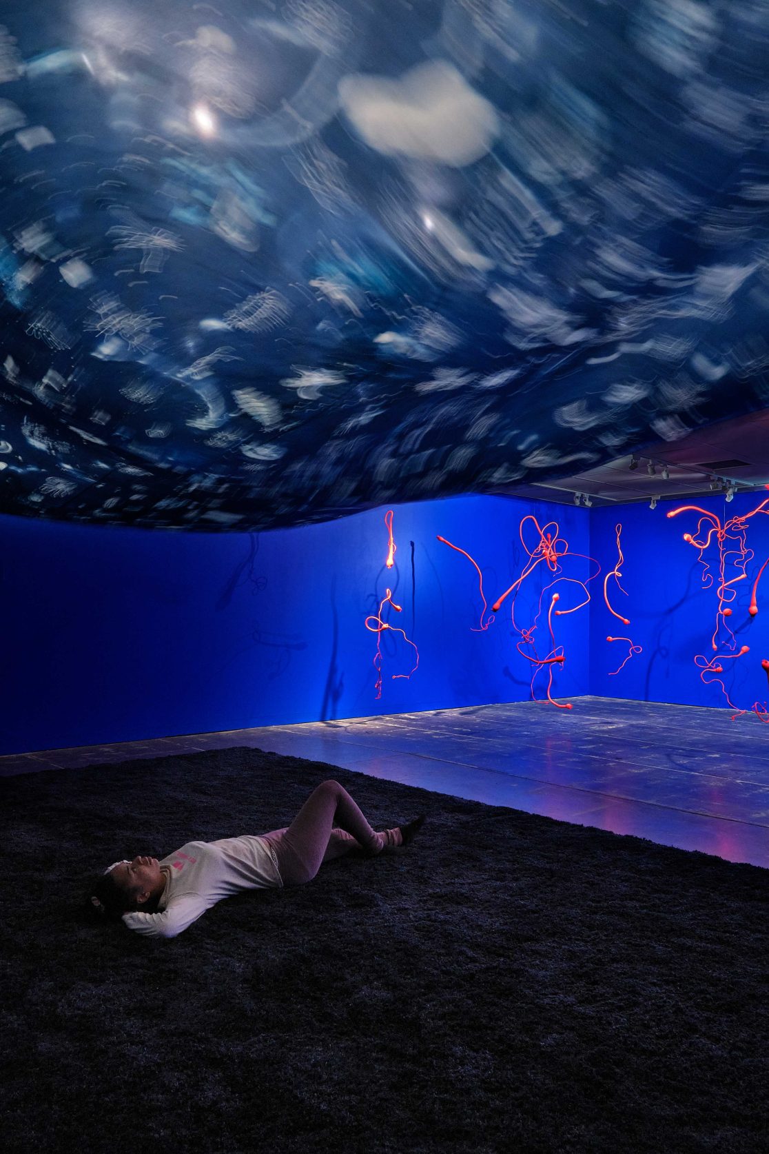 A forest of mobiles comprised of fluorescent red Northern California bull kelp is set against flowing cyanotype-printed fabric suspended below the gallery ceiling. The kelp mobiles gently rotate and visitors are invited to activate the movement of the fabric by pulling on rings set to either side of the gallery. Plush carpeting below the cyanotype allows visitors to recline and view the rippling fabric above. This immersive environment invites a practice of observation akin to augury—the reading of cast objects and environmental patterns to divine meaning. Casting, Sinking, Feeling draws on these visual languages of augury to imagine alternative forms of knowing as we face the irreversible human impact on marine ecosystems and plunge into an unknown future of emergent adaptations.