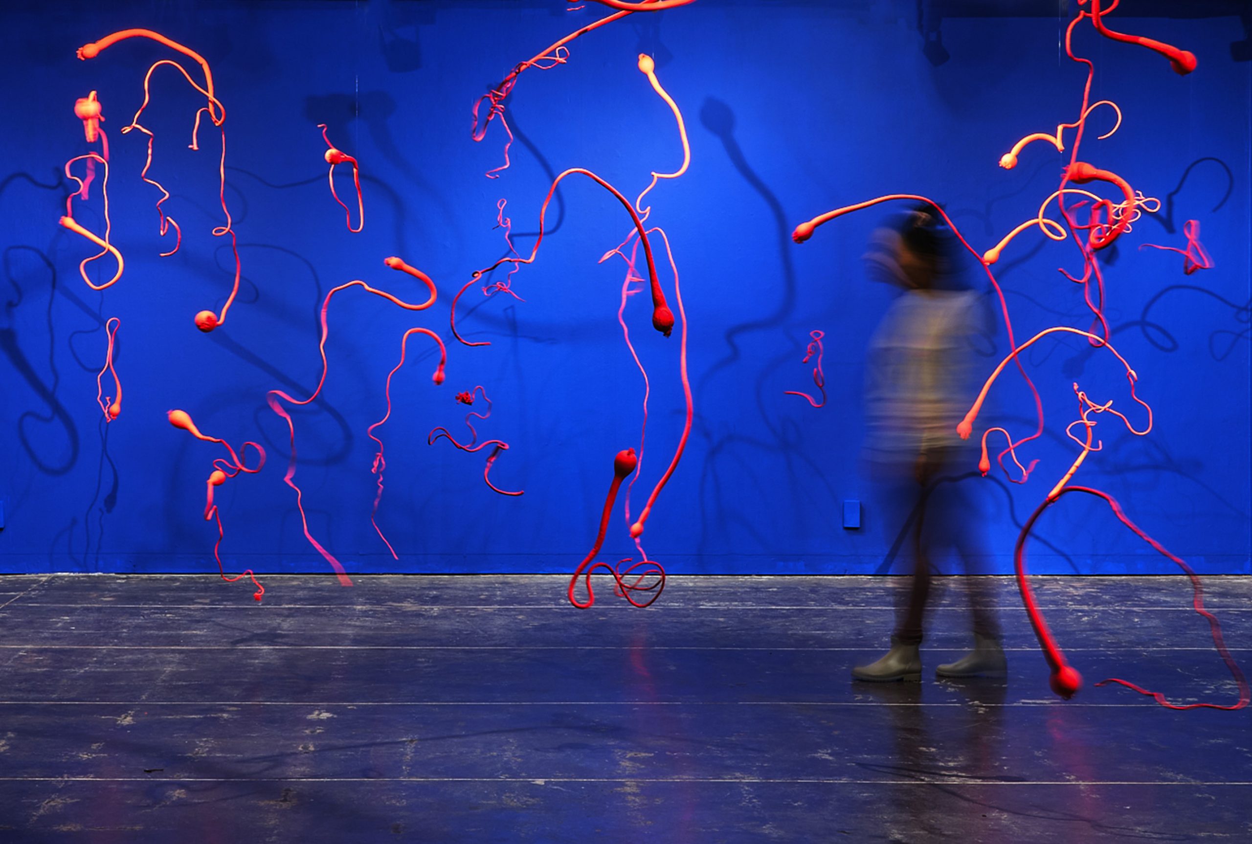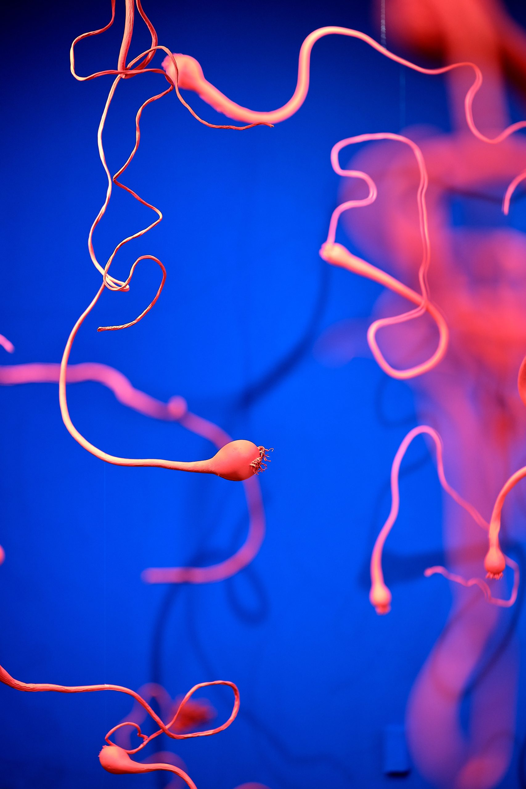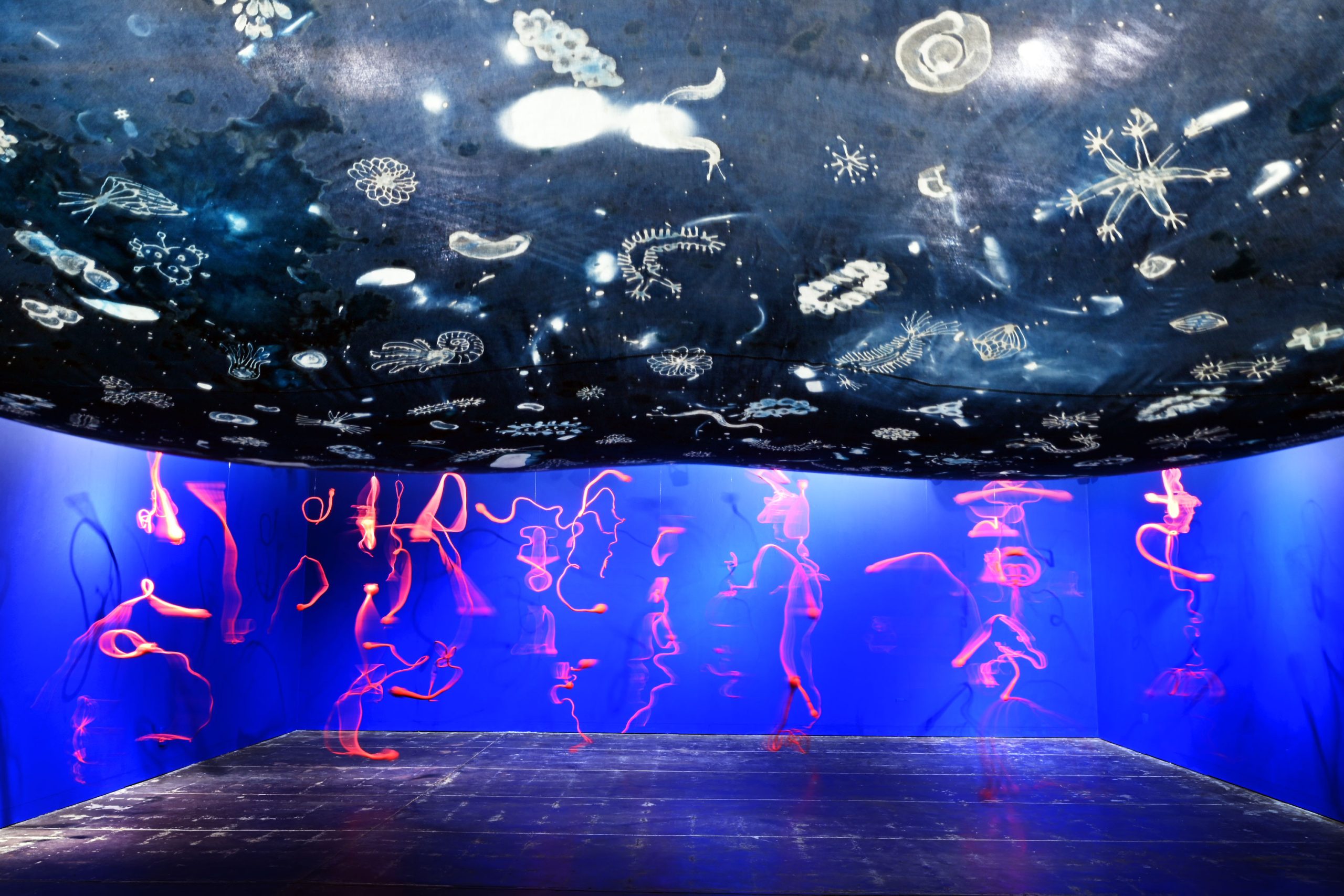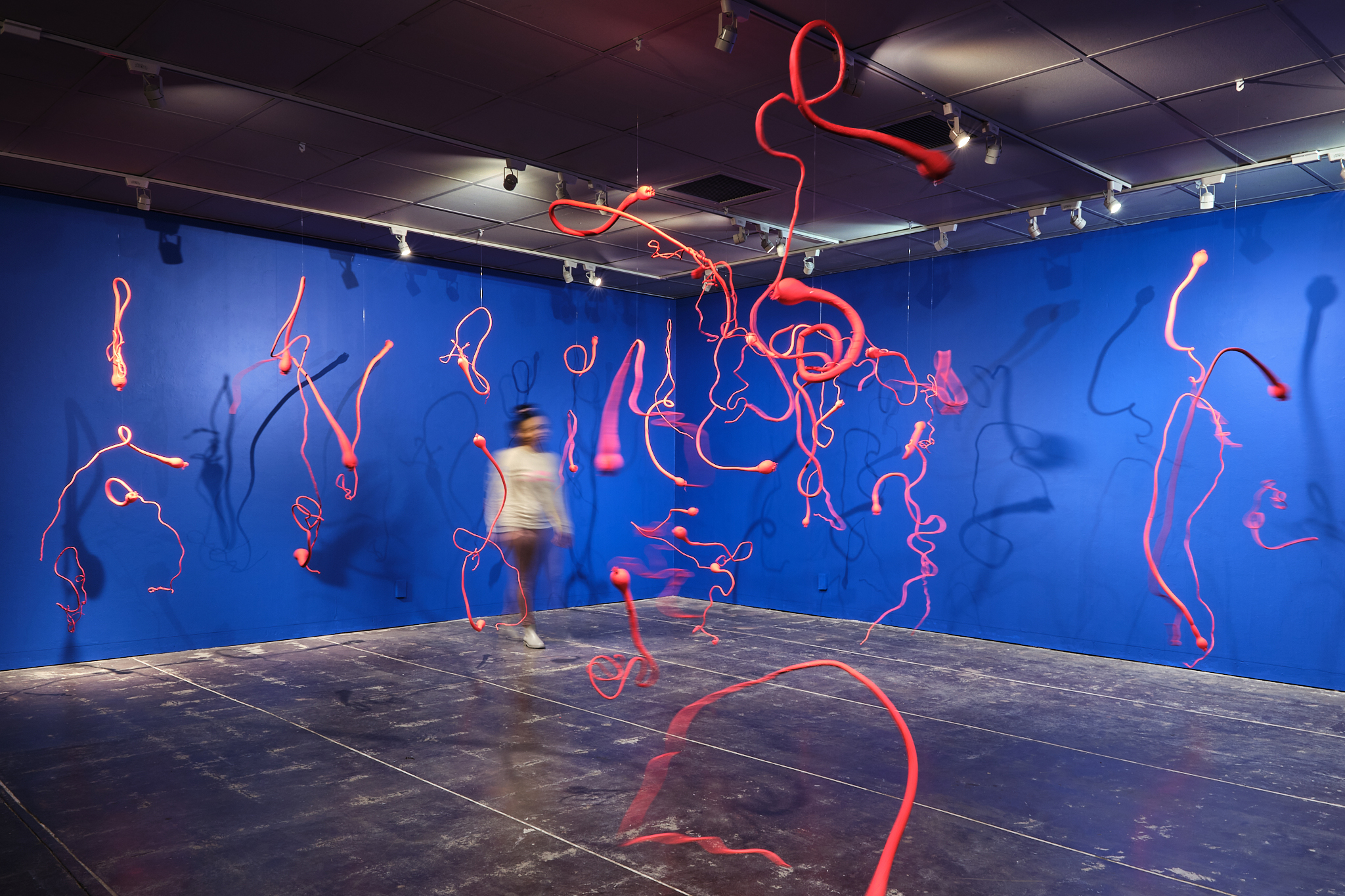 A forest of mobiles comprised of fluorescent red Northern California bull kelp is set against flowing cyanotype-printed fabric suspended below the gallery ceiling. The kelp mobiles gently rotate and visitors are invited to activate the movement of the fabric by pulling on rings set to either side of the gallery. Plush carpeting below the cyanotype allows visitors to recline and view the rippling fabric above. This immersive environment invites a practice of observation akin to augury—the reading of cast objects and environmental patterns to divine meaning. Casting, Sinking, Feeling draws on these visual languages of augury to imagine alternative forms of knowing as we face the irreversible human impact on marine ecosystems and plunge into an unknown future of emergent adaptations.