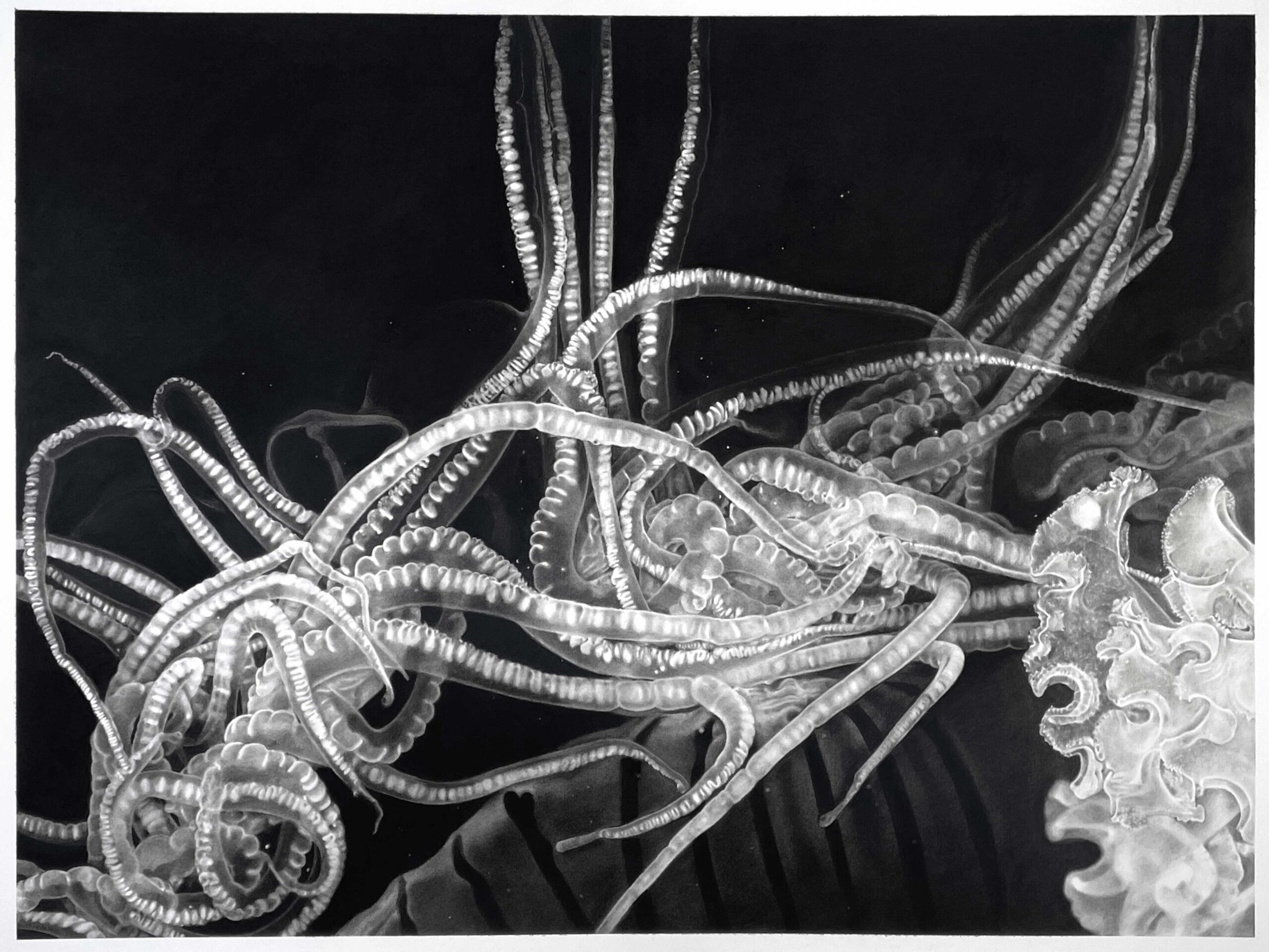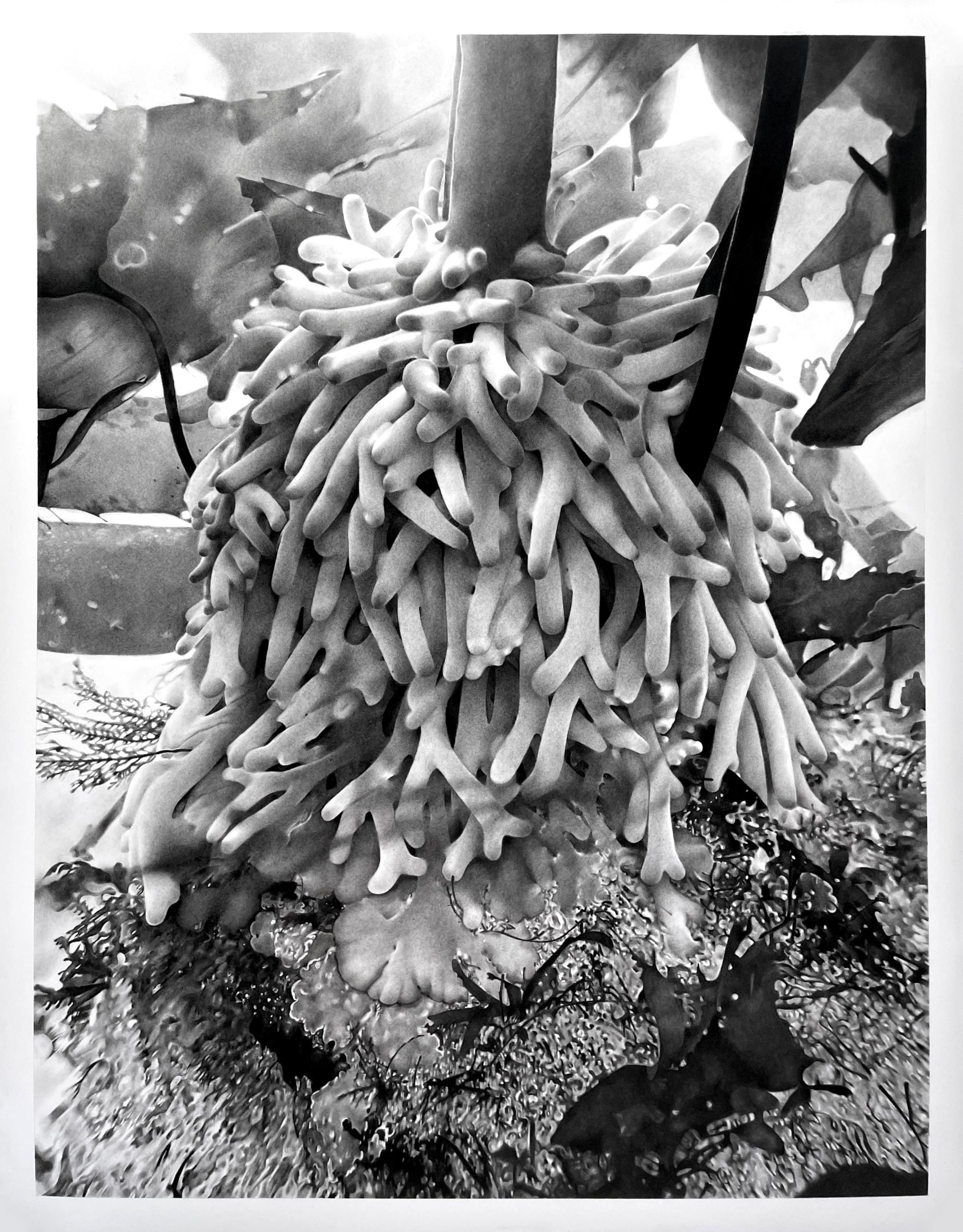 Hold Fast, a series of seven large charcoal drawings, invites the viewer to take a closer, slower, and stranger look at some of the key inhabitants affected by the decimation of Northern California’s kelp forests. It proposes that stewarding with integrity and wisdom requires us to first enter into intimate, witnessing relationships with the places and creatures we live alongside.