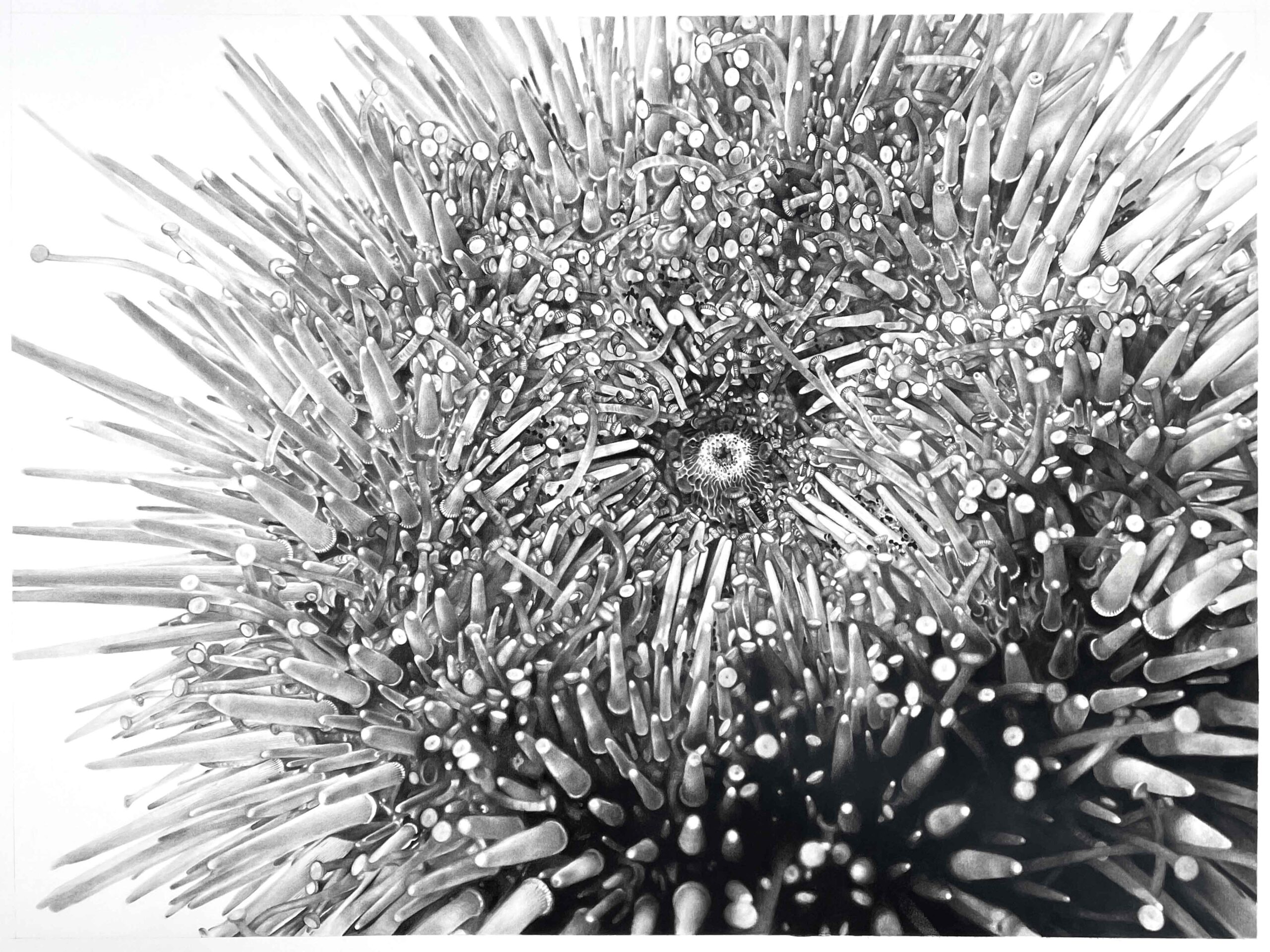 I began Hold Fast in 2019, after noticing the alarming transformation of the kelp habitats I regularly dove at, and realizing that the devastation, unseen below the veil of the ocean’s surface, was not receiving the visibility it deserved. My drawings are largely based on photographs I took while diving, with the exceptions of Sea Otters, which is based on photographs I took at the Monterey Bay Aquarium, and Largest Abalone Ever Found, which references an internet-sourced image. For me, the intense labor and photorealistic detail of my drawings are an expression of the kind of deep seeing and attending that relational environmental stewardship demands of us.