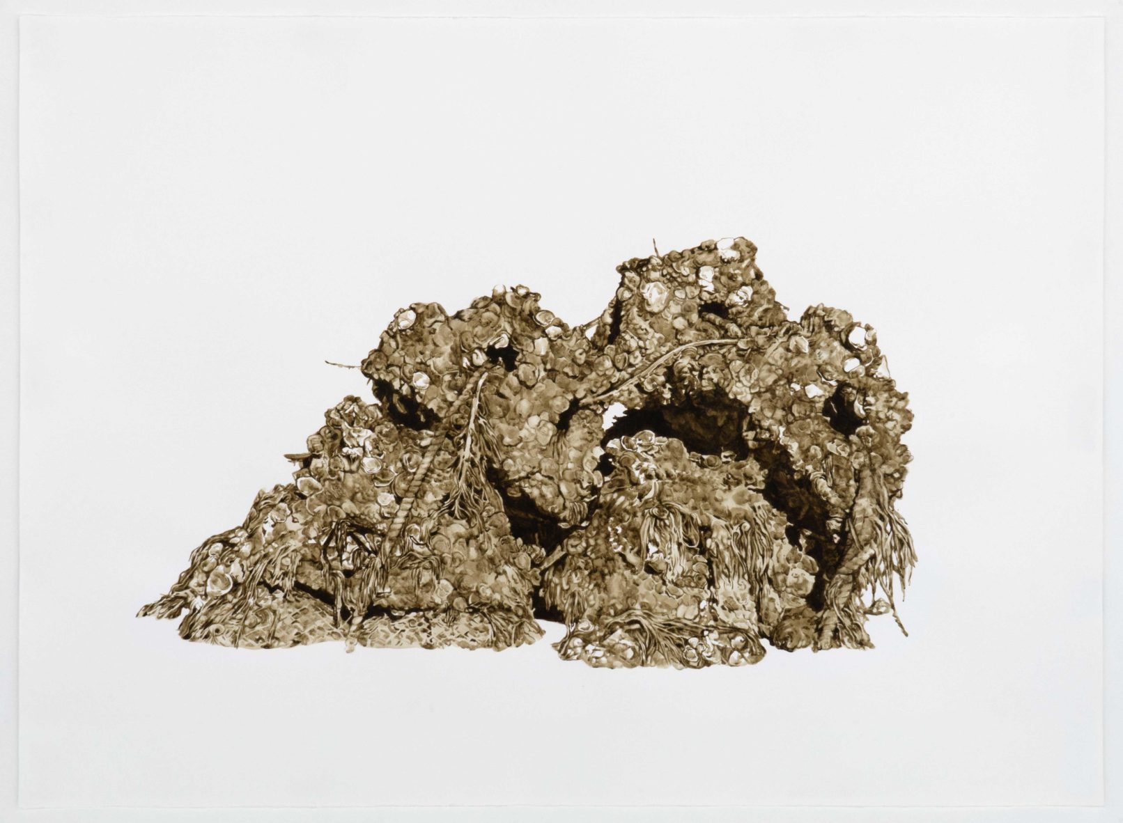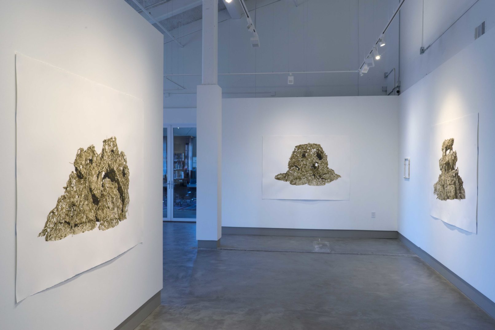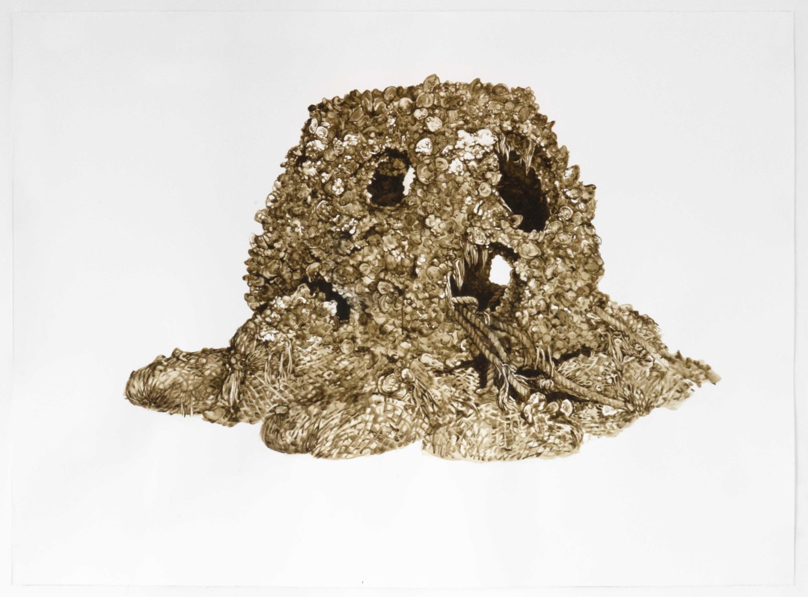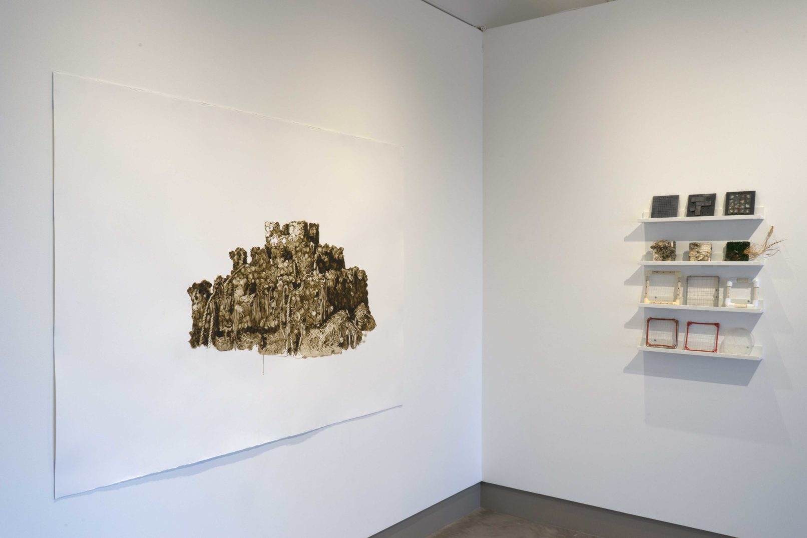 Tanja Geis partnered with the Smithsonian Environmental Research Center (SERC) to develop an exhibition responding to their work monitoring, conserving and restoring the San Francisco Bay. For Embark, Geis reimagines the substrates set in the bay for colonization by Ostrea lurida, the native oyster, for a series of phantasmagoric drawings made using mud pigment from the Bay. These drawings are shown alongside a video installation, shot in research tanks at the Romberg Tiburon Center, and a collection of tools used to measure ecosystem health.