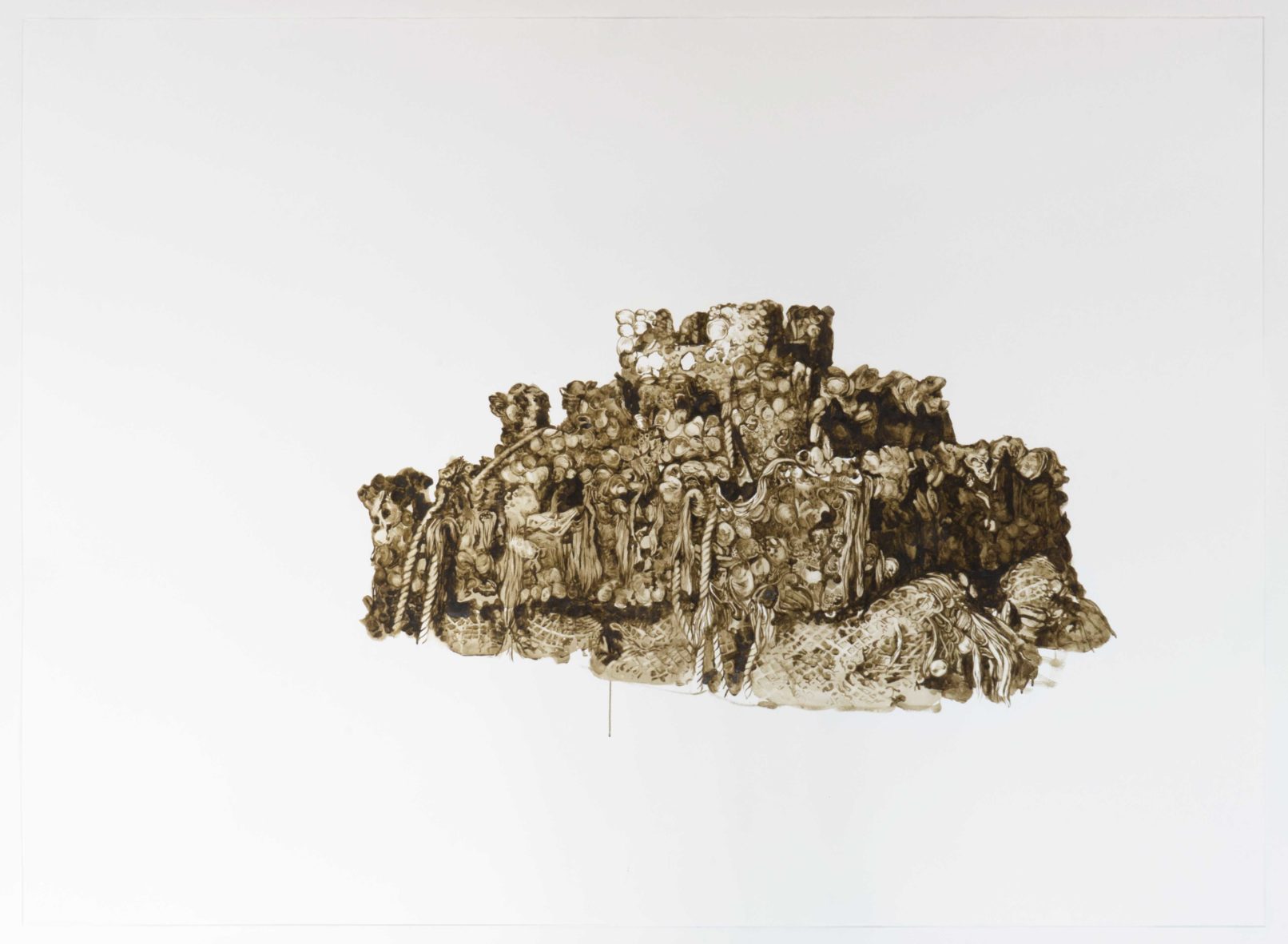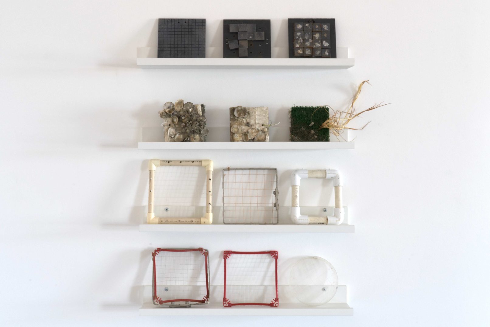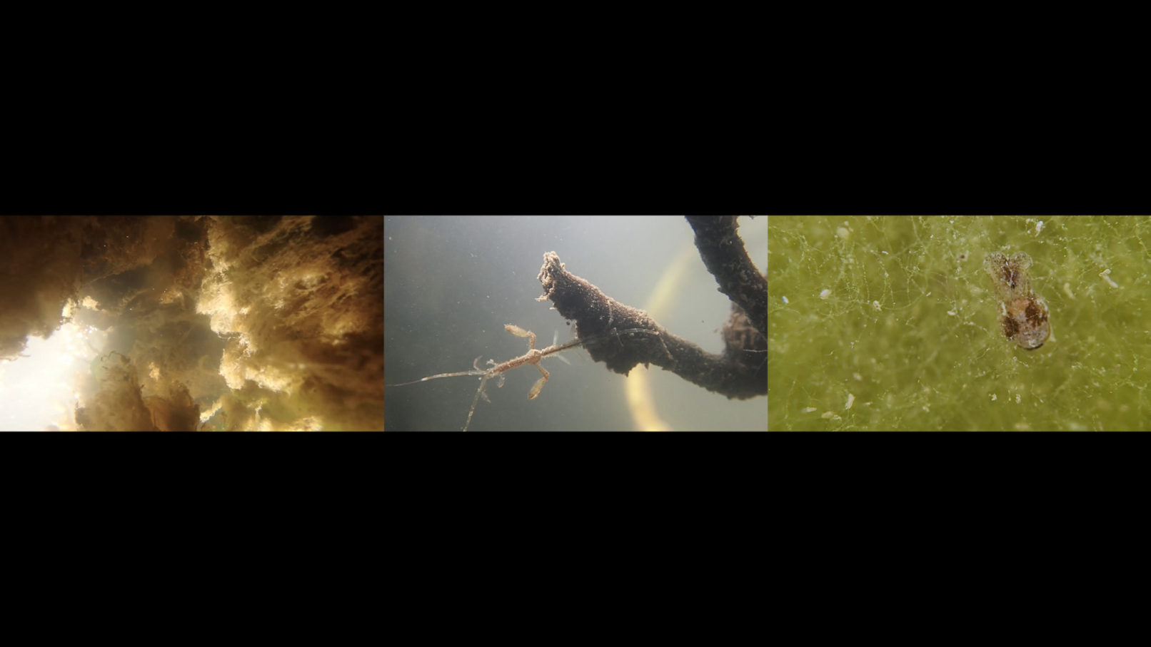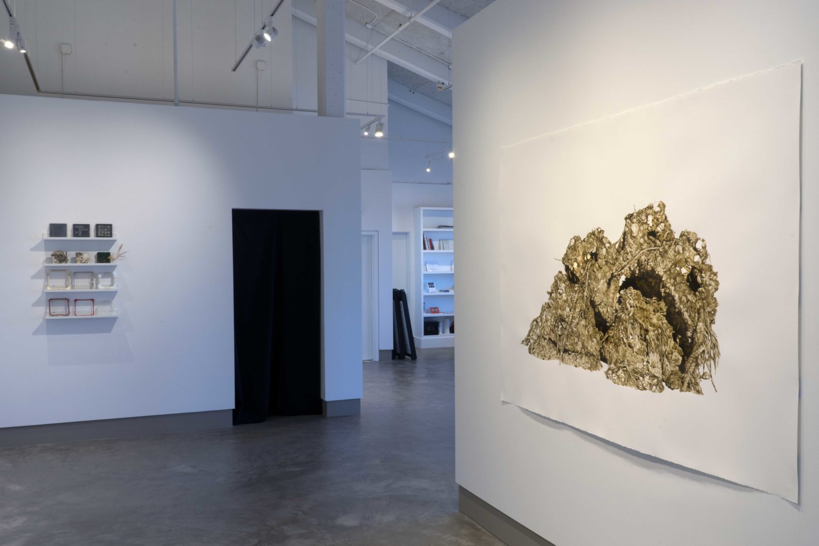 Tanja Geis partnered with the Smithsonian Environmental Research Center (SERC) to develop an exhibition responding to their work monitoring, conserving and restoring the San Francisco Bay. For Embark, Geis reimagines the substrates set in the bay for colonization by Ostrea lurida, the native oyster, for a series of phantasmagoric drawings made using mud pigment from the Bay. These drawings are shown alongside a video installation, shot in research tanks at the Romberg Tiburon Center, and a collection of tools used to measure ecosystem health.
