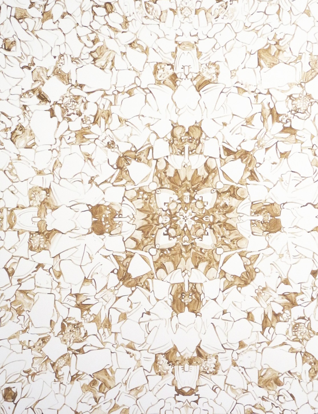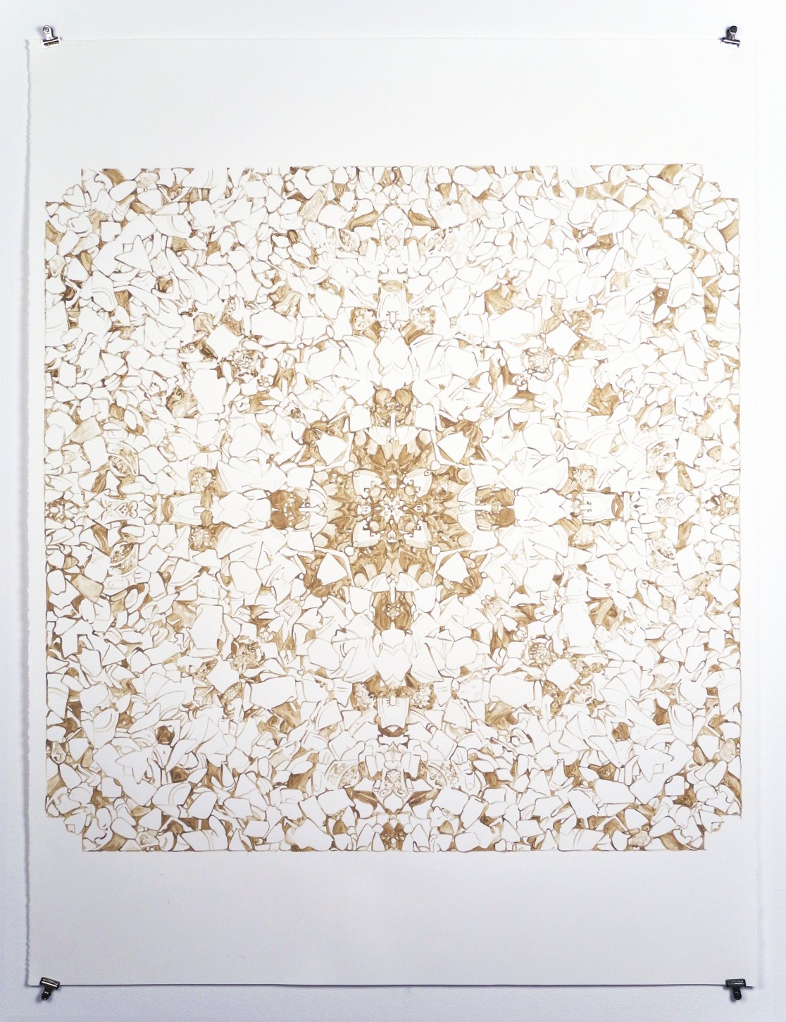 The Mud Map paintings are made with mud pigment collected along the shoreline of San Francisco Bay in Richmond, CA, and based on imagery of debris and flotsam photographed in the same area. Their form references the mandala—a Buddhist symbol of the cosmos and life cycle that offers an ordering logic in a seemingly chaotic world. The Mud Maps self-consciously explore my very human tendency to seek meaning, pattern and narrative in disorderly surroundings and experiences. As the Enlightenment conception of an orderly, harmonious, fully knowable ‘nature,’ distinct from the human, unravels, and as I fumble for a new ethic of environmental conduct, this impulse has grown stronger but also less tenable.
