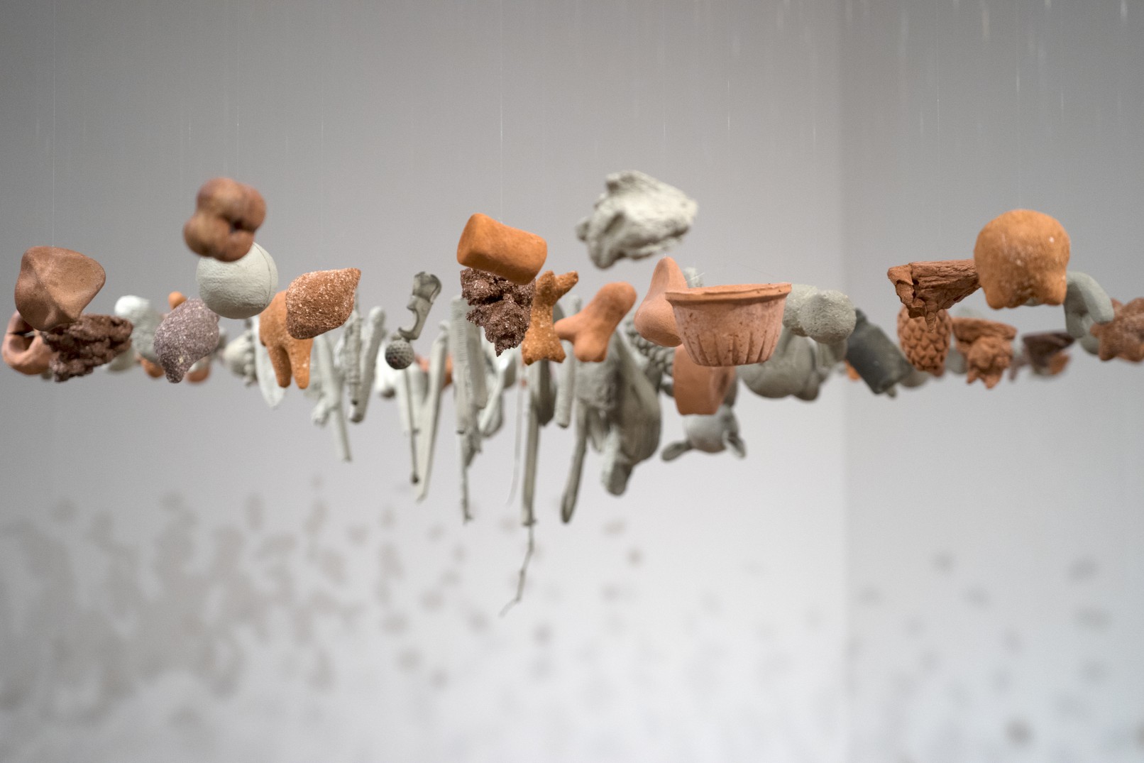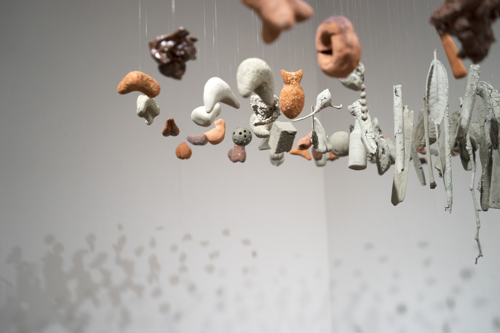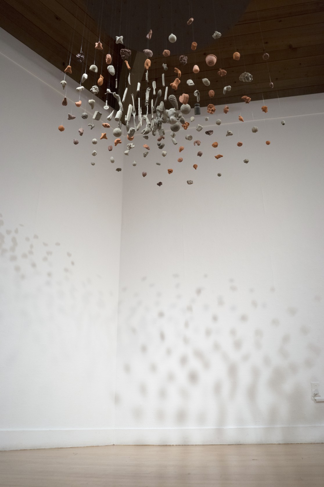 Muddle of Littoral Artifacts is a collection of suspended small sculptures made from fired and unfired mud collected along the shoreline of San Francisco Bay in Richmond, CA, as well as debris and flotsam collected in the same area, coated in the aforementioned mud.