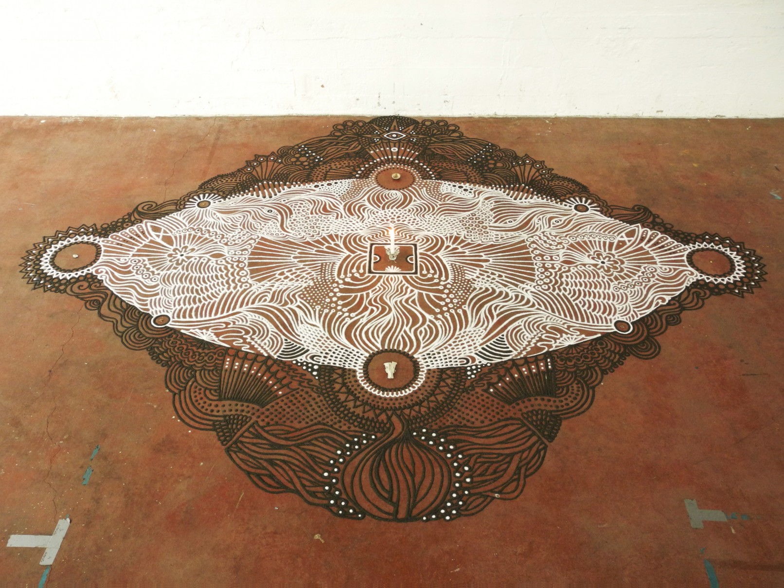 The installation used black volcanic sand from the local beach, Atlantic sea salt, and other found and gifted objects including bones, shells, glass and wax. Piles of sand and salt and funnels were available to visitors to create their own patterns. At the end of S.E.A.S. Fest the installation was swept up and returned to the beach from which the sand originated.