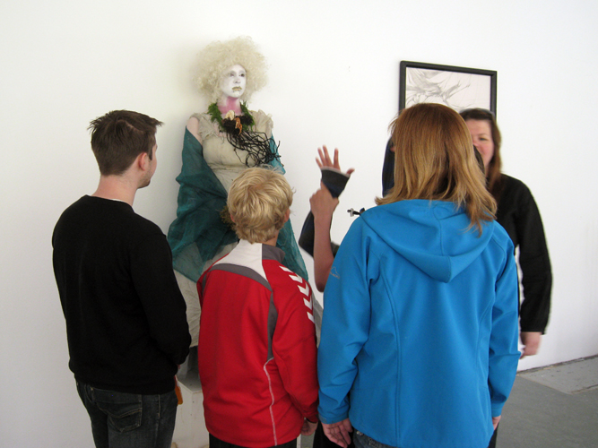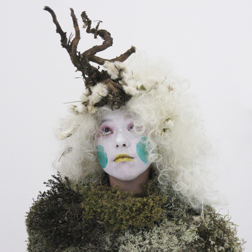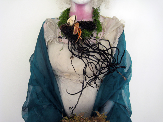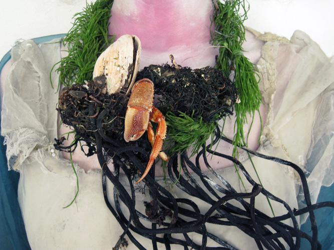 The necklace is made from horsetails, seaweed, crab shells, and mussel shells. The costume in the last image was made of hillside mosses and plant roots and other plant materials found along a stream bed.